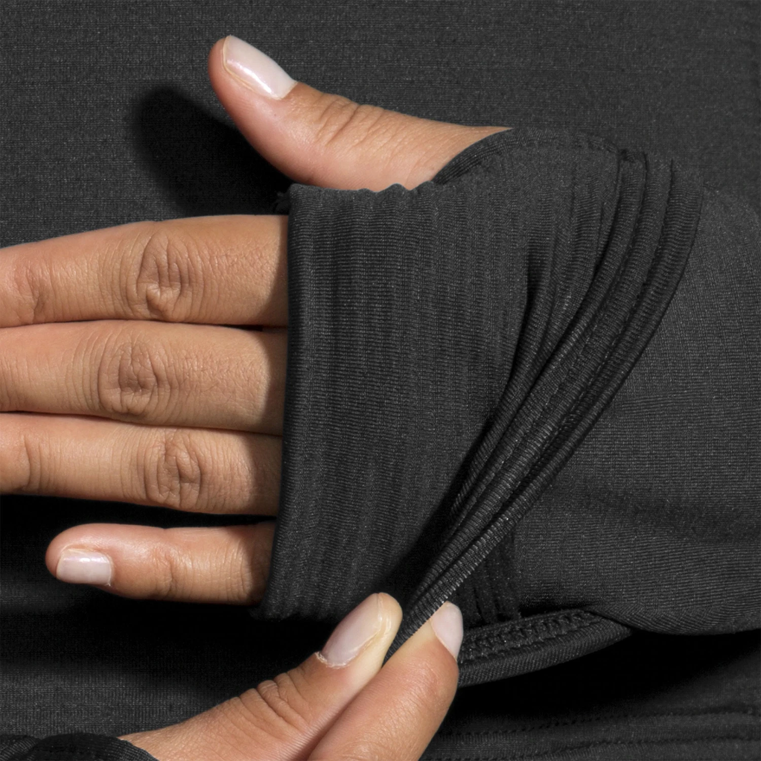 - Material: 91% Polyester / 9% SpandexSemi-FittedThumbholesFold-Over Hand MittTwo Hand PocketsInternal Stash PocketExternal Hanger LoopBreathableSweat-Wicking-