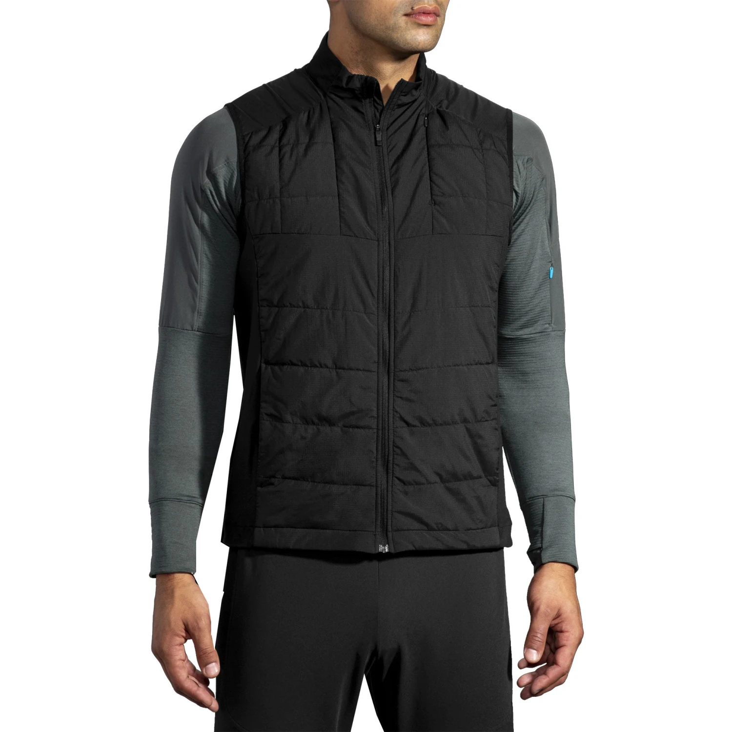Get ready for cold weather runs with the Brooks Shield Hybrid Mens Running Vest. Combining warmth, storage and weather protection, this running vest has everything you need for cold weather adventures. Wind and water-resistant paneling keeps the elements out, while strategically placed knit fabric still delivers stretch and mobility. Zip-secure hand pockets and a chest pocket keeps your valuables safe as you run.