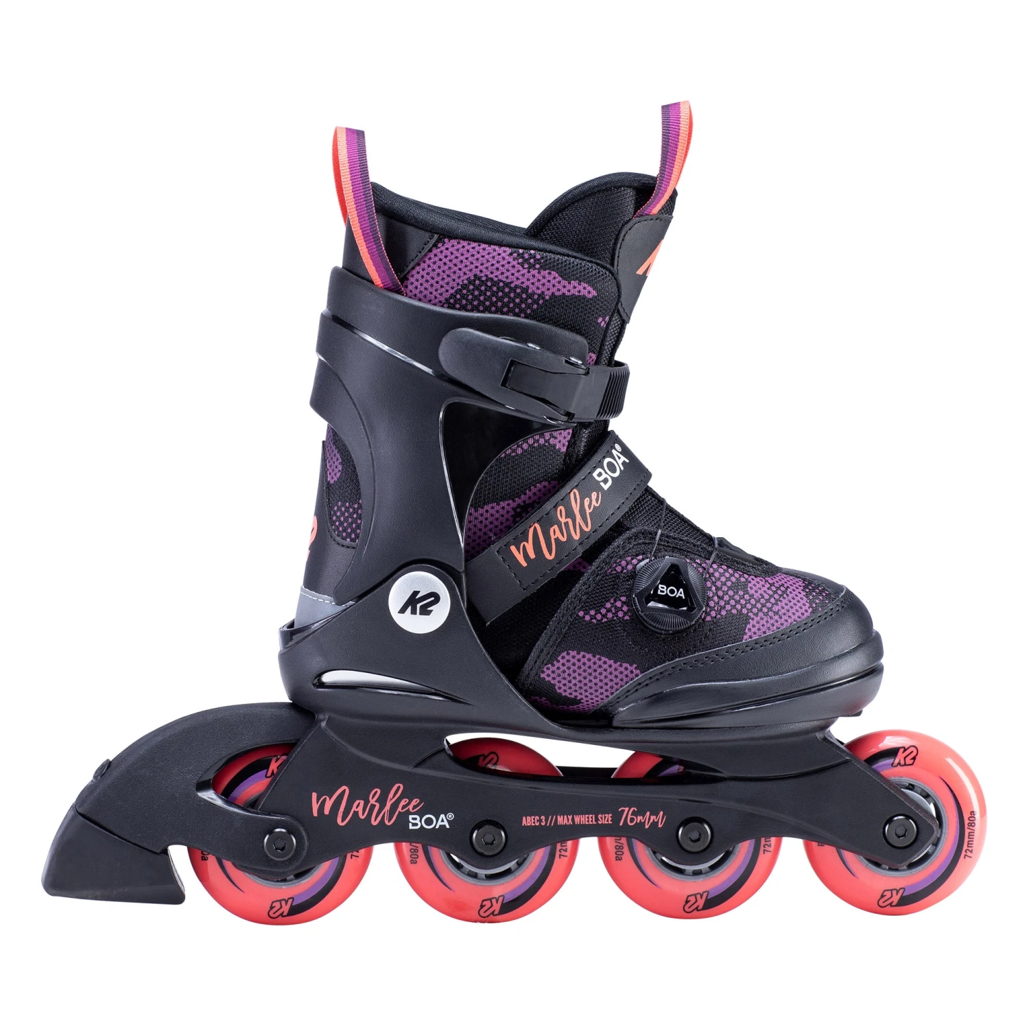 Give your little girl a great skate to start with in the K2 Marlee Boa Inline Skate. This skate is adjustable for up to five sizes so that as her foot grows you will not have to buy a new pair right away and can also be handed down to younger children. The Boa Fit system is super easy to get the right fit dialed in making this great as Mom and Dad will not have to get her dialed in. The 72mm wheels and F.B.I. frame will absorb road vibrations to provide a smooth roll and also provide enough speed that will get her to enjoy skating.