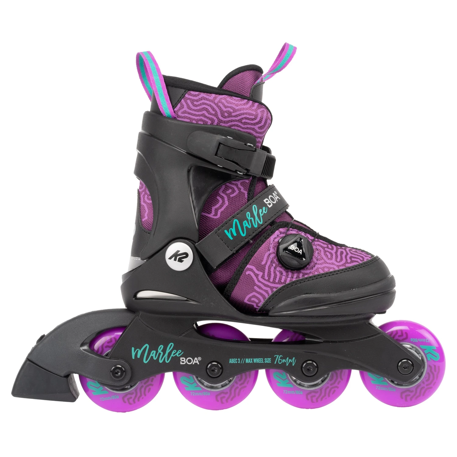 Excel at skating with the K2 Marlee Boa Adjustable Inline Skates. The Marlee Boa features the Boa fit system with a Stability plus cuff that provide a secure fit with plenty of support to give them a comfortable skating experience. The F.B.I. frame helps absorbs vibrations and with 72mm wheels with ABEC 3 bearings provide skaters a secure, comfortable roll at all times. The five sizes of adjustability allow this skate to grow with your childs foot so they will last for multiple seasons.