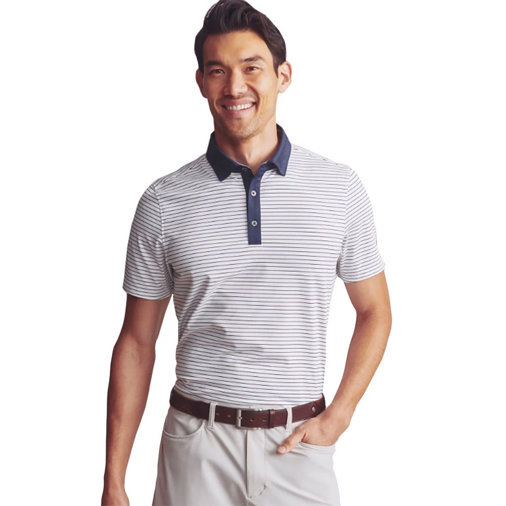 The Rhone Sport Feeder Stripe Men’s Golf Polo is a stylish and functional choice for golfers seeking both performance and comfort. Crafted from a breathable poly-spandex blend, this polo offers four-way stretch and moisture-wicking properties to keep you cool and dry during your game. The feeder stripe pattern adds a touch of sophistication, while the modern fit ensures a sleek silhouette on and off the course. With UPF 50+ sun protection and GOLDFUSION – technology, this polo is designed to keep you feeling fresh and protected throughout your round.
