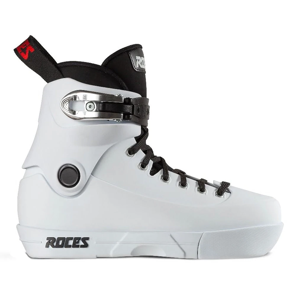 Get excellent support and durability with the Roces Fifth Element White Aggressive Boot. The Fifth Element boot features a biomaterial hard PU shell and cuff for a comfortable fit. This boot has a stiffer PU shell that features an aluminum memory buckle and lace closure system for a secure, comfortable fit. There is a dual shock absorber footbed that adds to the comfort every time you step inside.